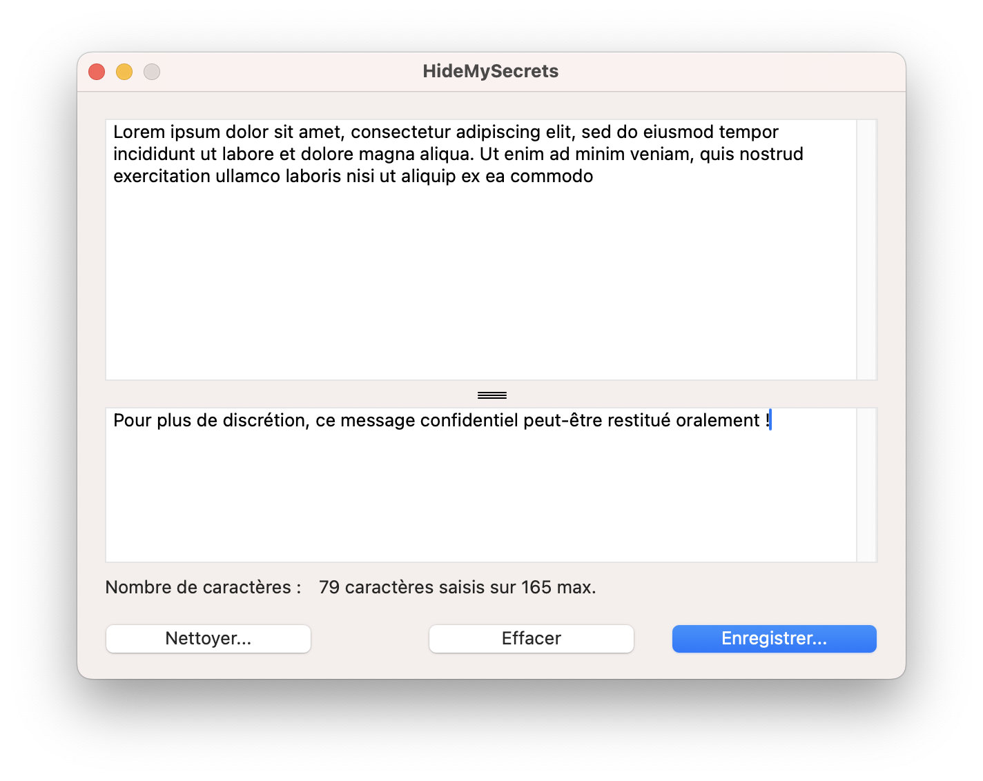 HideMySecrets est une expérience de stéganographie textuelle qui consiste à dissimuler des messages secrets dans un texte ordinaire. Elle utilise des caractères Unicode invisibles pour encoder l'information cachée. Le texte résultant, compatible avec des éditeurs standards comme TextEdit, semble normal mais contient un message secret extractible uniquement par les initiés, assurant ainsi une communication discrète.